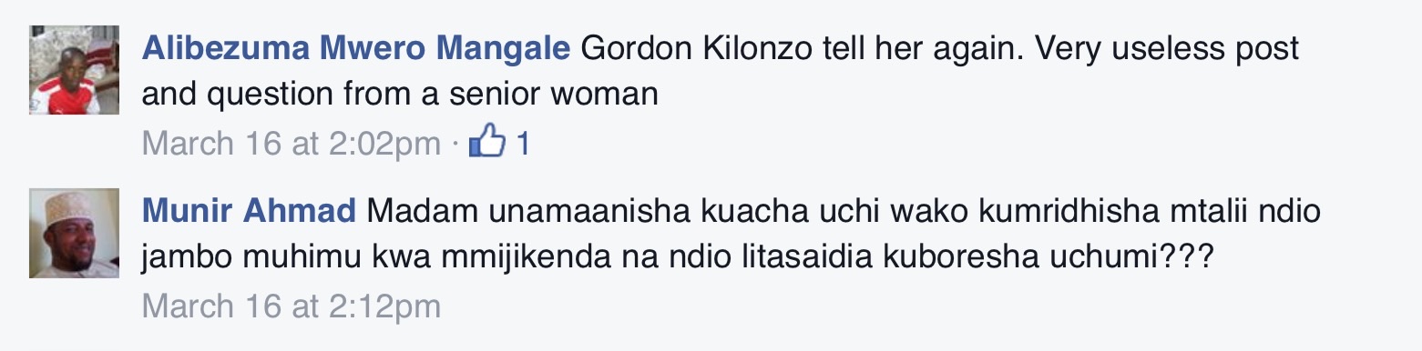 “Look at all the people supporting Miss Mbura on Facebook and show me one woman.”