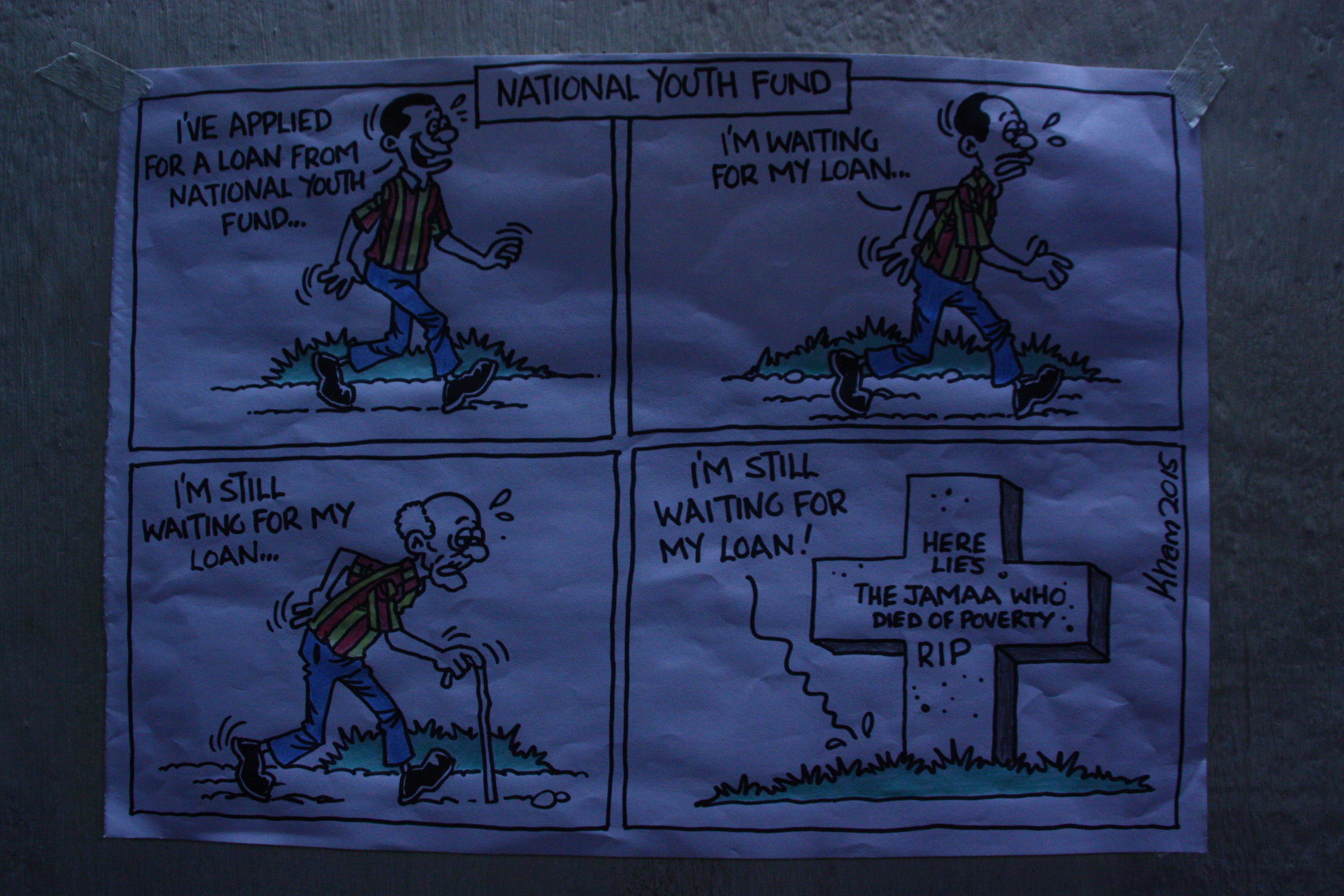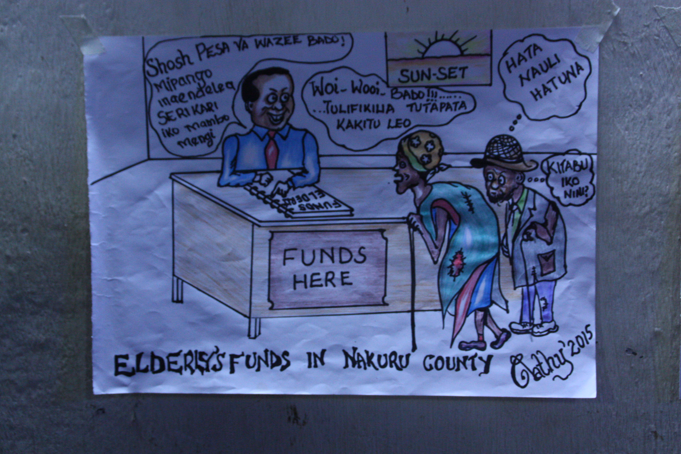 One of such cartoons shows an Member of County Assembly (MCA) who has taken funds belonging to the youth to benefit himself. Either the cartoon also shows the youth have to bribe the MCA if they are to get their rightful share of government funds.