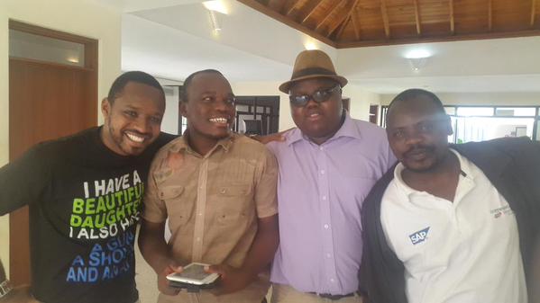 From left, Boniface Mwangi, Abraham Mutai (@ItsMutai), His lawyer @Olez and the Bloggers Association of Kenya (BAKE) Chairman Kennedy Kachwanya this morning after Mutai’s release