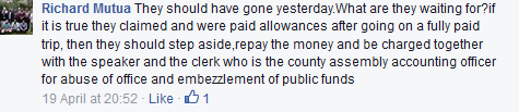 Nguumo MCA and Minority Leader John Mwenze, Deputy Speaker Bernard Musau of Makindu ward and counterparts Cosmus Mutunga of Emali/Mulala, Bensely Mathuku of Kikumbulyu South, Timothy Maneno of Nguu/Masumba ward and Bernard Kiswii of Kikumbulu North ward appeared in the Ethics Commission and Anti-Corruption (EACC) list for claiming per diem after a fully sponsored trip to Dubai by Kibwezi west MP Dr. Patrick Musimba.