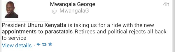 “We rejected these people at the ballot and now they have found their way back into power through the appointments. Truly, Kenya hasn’t changed since Kenyatta and Moi times when sycophants afraid of staying in the political cold would be appointed to various board positions; disregarding the interests of Kenyans.”