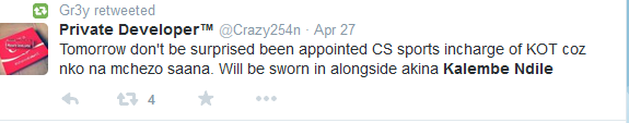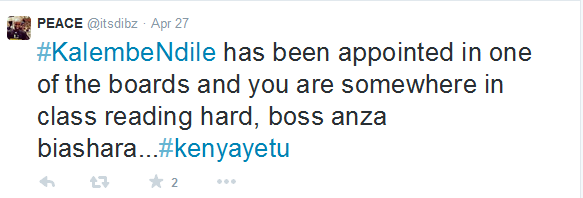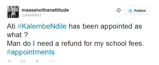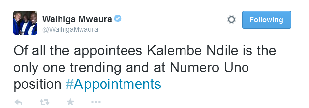 Under the hash tag #KalembeNdile, the TIP leader trended in Twitter for the better part of Monday when the appointments were announced.