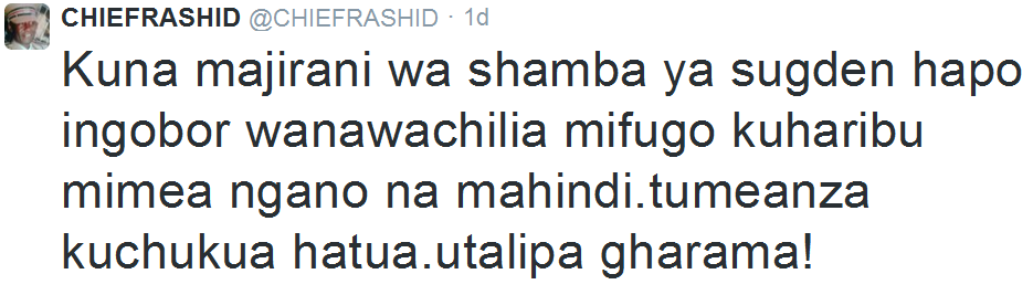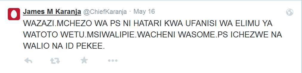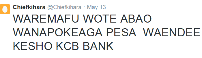 To confirm his word, you only need to do a quick search on twitter starting with @Chief upon which you will get at least five substantial responses: @Chiefkihara; @CHIEFKIMANI; @ChiefKaranja; @CHIEFRASHID and @Chiefkariuki, the last one being his.