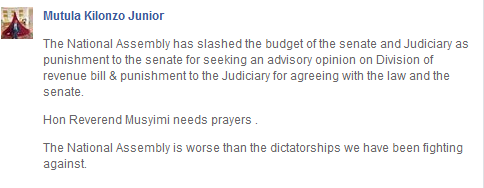 In his post, Mutula Junior castigated National Assembly terming it as worse than any dictatorships that the country has been fighting against.