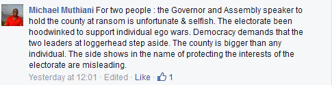 Others accused the governor and the speaker of holding the county government at ransom for their selfish gains noting that the county was bigger than any individual and they should step aside.