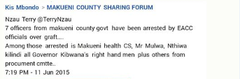 The post from Twitter and shared in a Facebook group called Makueni County Sharing Forum drew more than 200 comments within the first hour including the Governor and the other two officials who were erroneously mentioned.