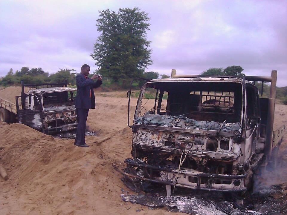 Shells of the two trucks burnt in Kasikeu Photo:Facebook