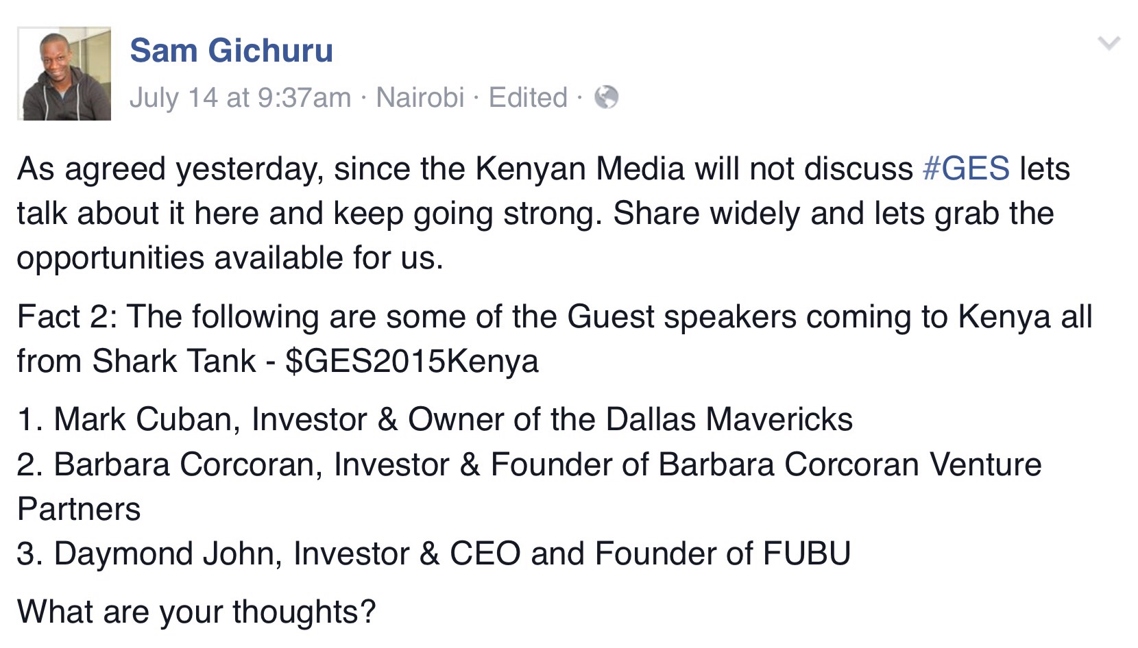 This was captured in a Facebook post by Sam Gichuru where he called on his followers to keep the GES summit debate alive on his wall following the disappointing coverage by the local media.